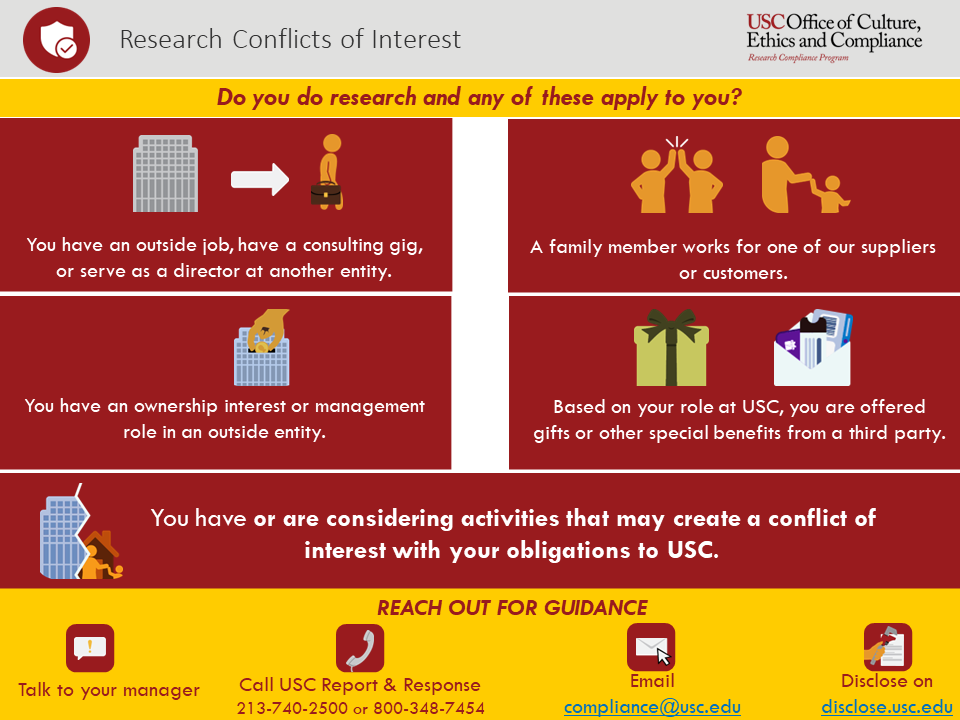 Education and training is an important pillar of a robust compliance program. To support that goal, OCEC developed this one-sheet guidance library in partnership with the research community to provide targeted and issue-specific guidance regarding key compliance obligations in order to assist researchers and administrators in our shared endeavor to promote the ethical and compliant conduct of research at USC. Each one-sheet provides an overview of the most important requirements to keep in mind, links to relevant university resources where additional information can be found, and key contacts to reach out to in the event you have additional questions.